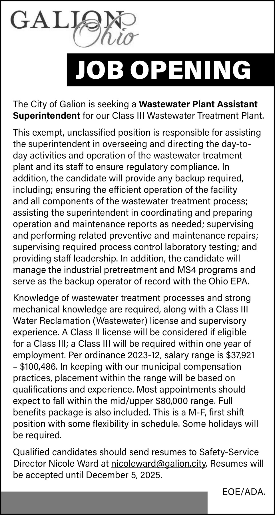 Nov 12, 2025. The City of Galion Jobs Ads from Galion Inquirer