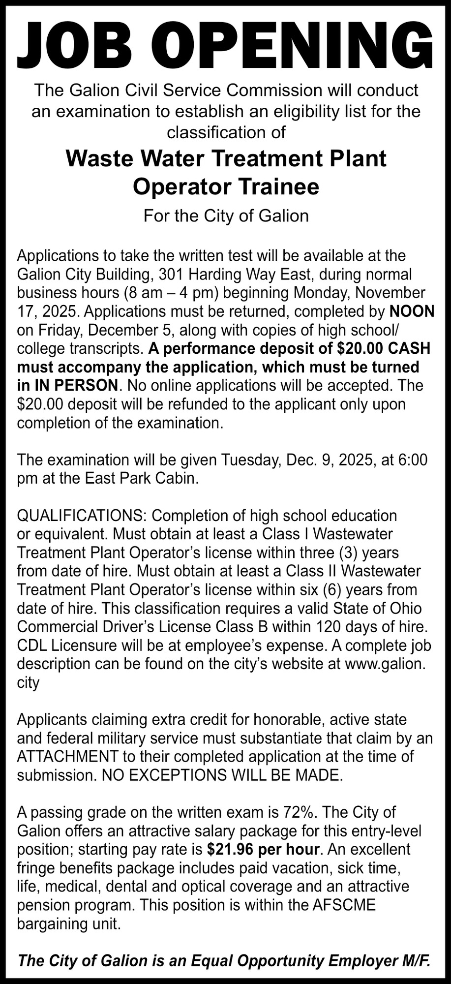 Nov 12, 2025. The City of Galion Jobs Ads from Galion Inquirer
