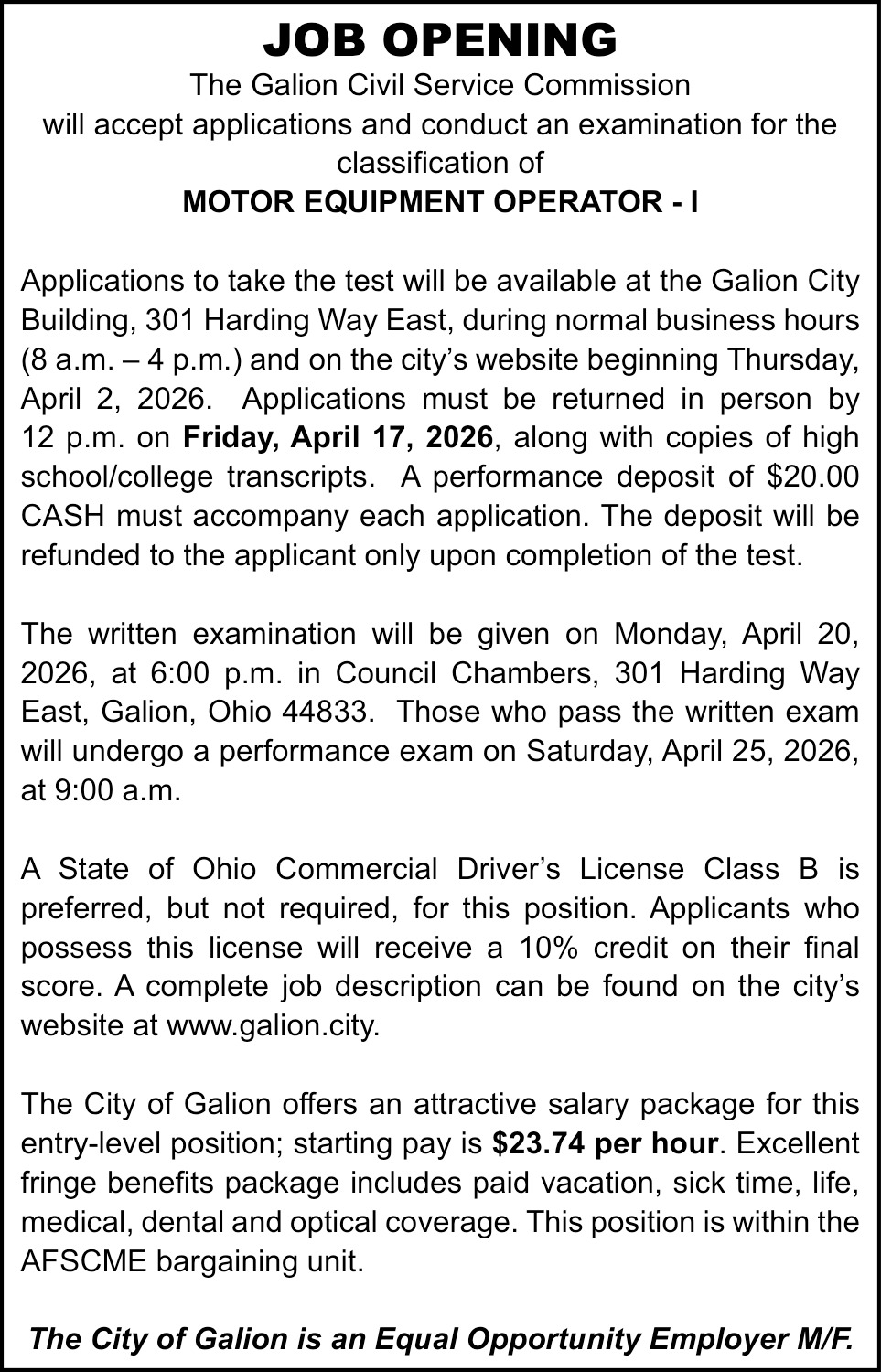 Apr 01, 2026. Galion Civil Service Comission Jobs Ads from Galion Inquirer